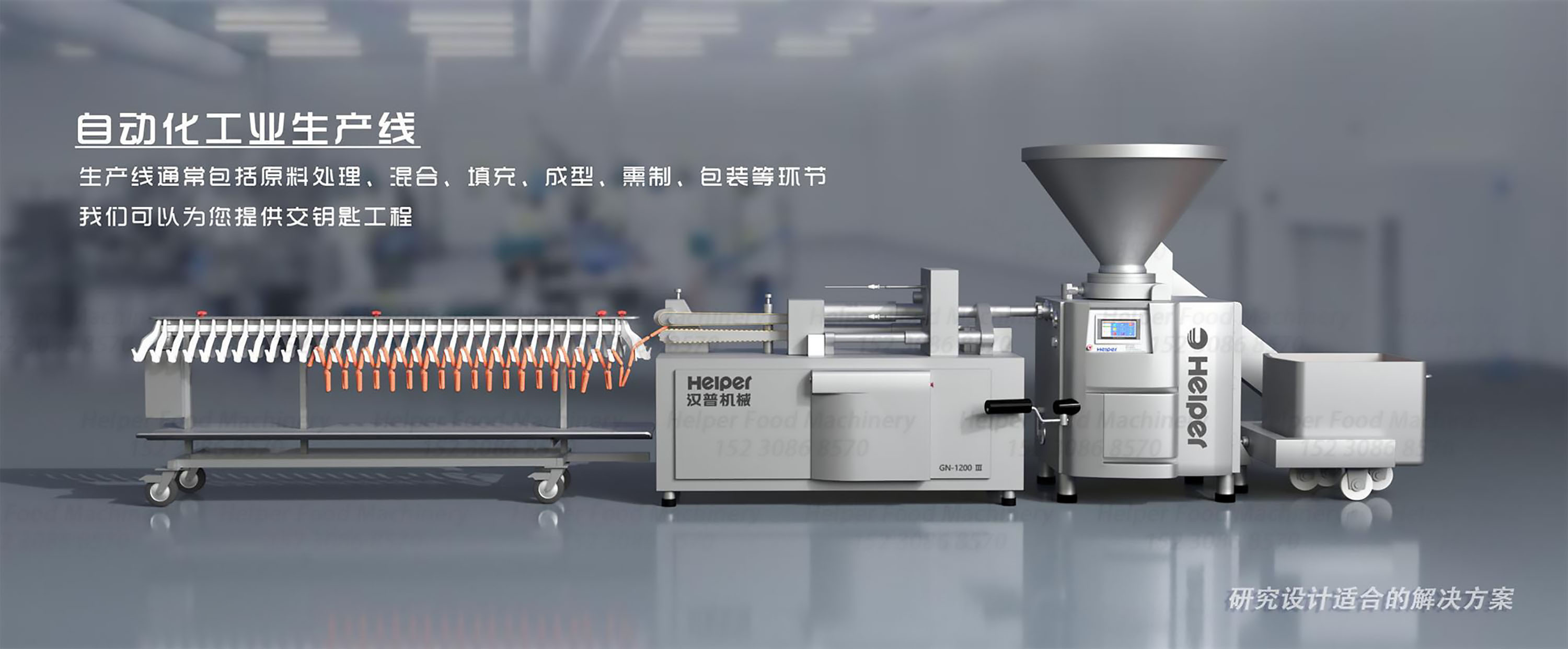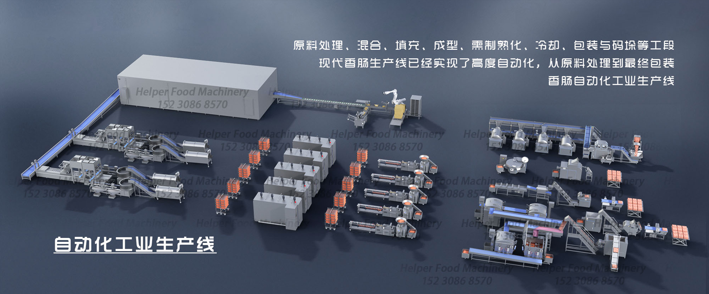 香肠生产线是一种自动化或半自动化的食品加工设备,是用于提高食品加工厂生产效率、标准化地生产香肠产品。通常包括多个环节,从前端原料处理到后端包装,涵盖了香肠制作的整个流程。