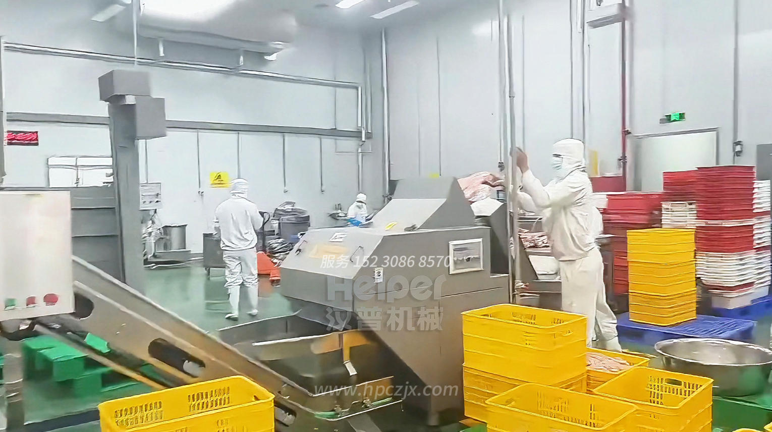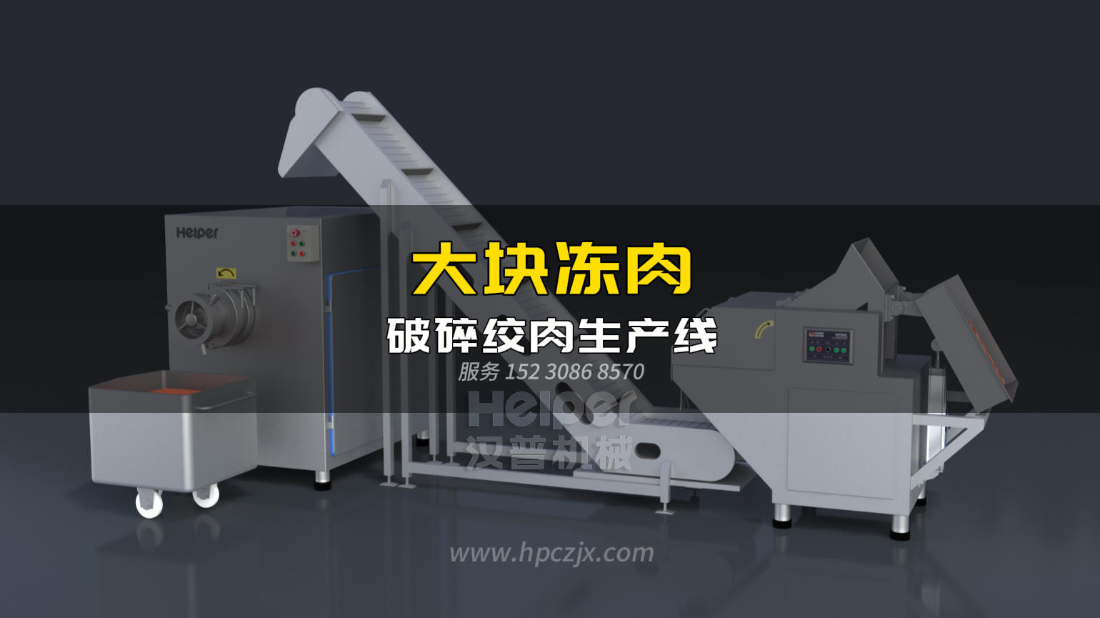这条生产线更侧重于,先将大块冻肉切片/刨片,大块冻肉切成均匀的薄片或小片,再通过自动化输送到绞肉机,进一步绞碎成肉馅,工艺更灵活,适用于对产品形态要求更高的场景。